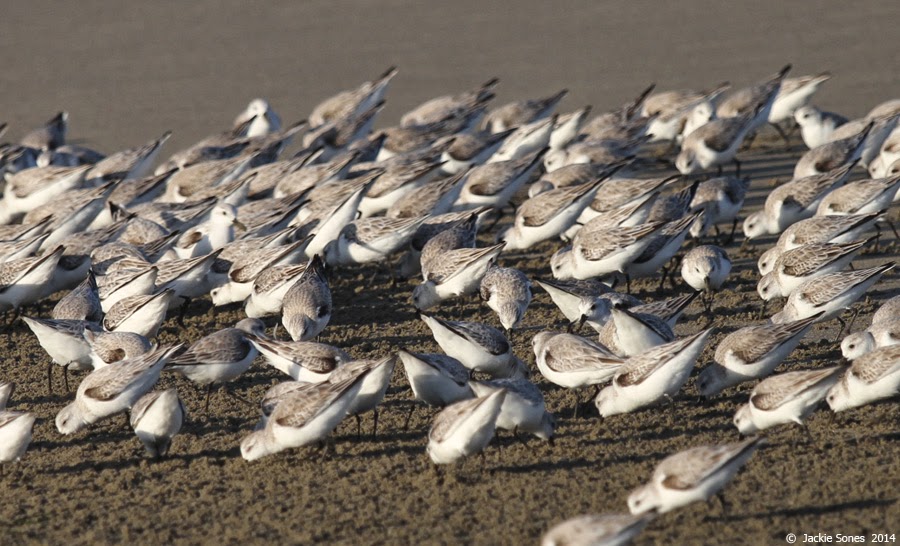 About a week ago we came across a flock of Sanderlings on the outer beach.  They were in the swash zone, but didn't seem to be feeding there.