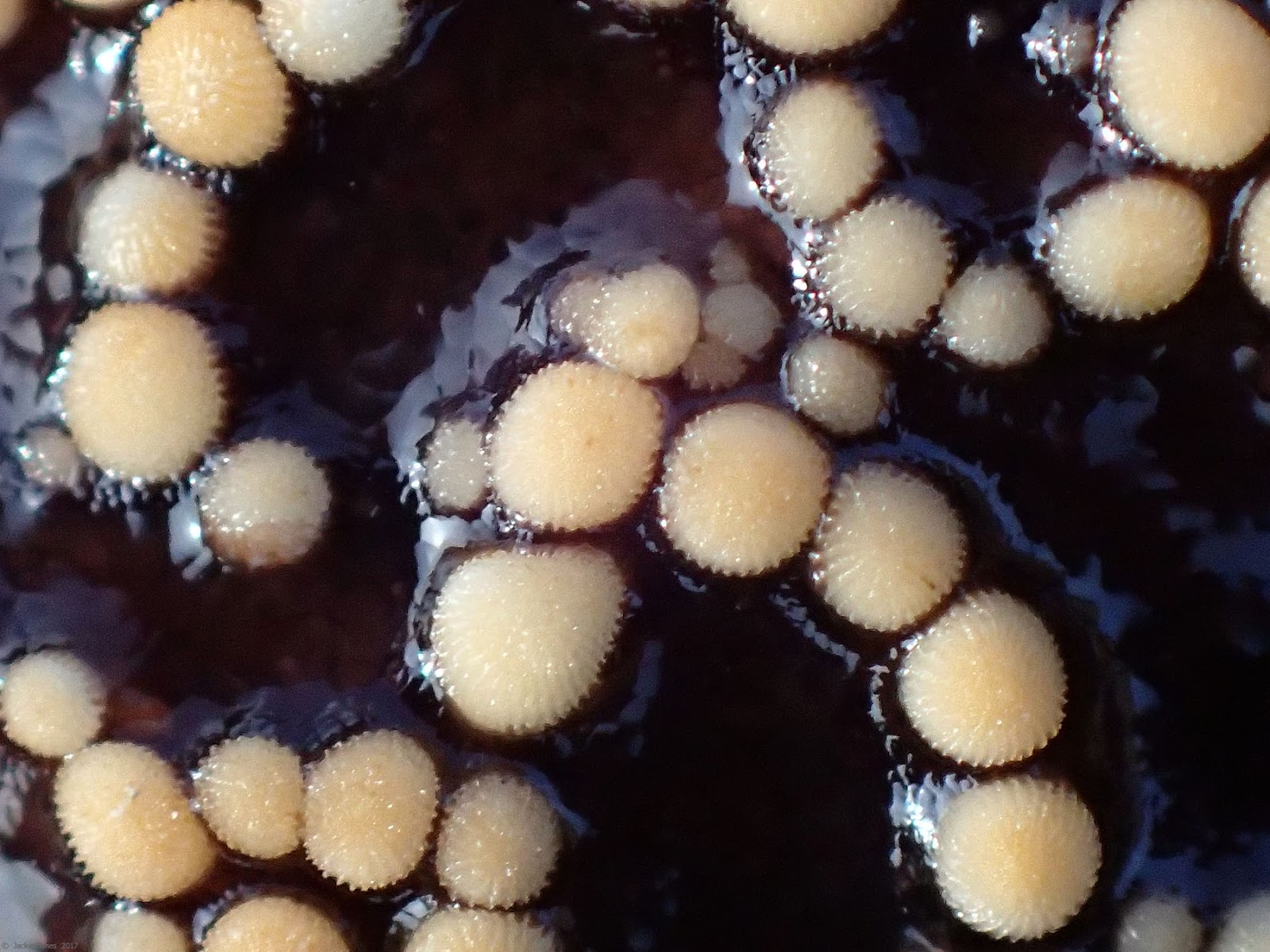 These are close-ups of the spines of an Ochre Sea Star (Pisaster ochraceus). The spines are made of calcium carbonate and are external projections of the sea star's internal skeleton. Most of the time, we're used to seeing the spines from farther away, scattered across the surface of the sea star: