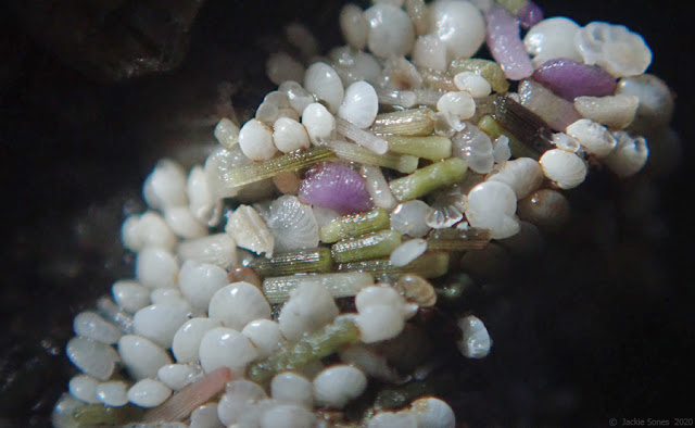 More often, these worm tubes are made of darker colored sand grains (see the post "A close call" for examples of the more typical tubes). But the tubes we saw this weekend really stood out — beautiful white foram shells cemented together with green and purple urchin spines and skeleton pieces.
