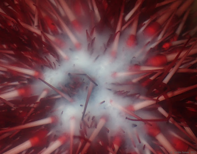 There were also a couple of other echinoderms spawning. Here's a male Red Sea Urchin (Mesocentrotus franciscanus) releasing sperm: